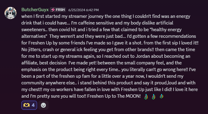 After seven years and rigorous pharmacy and chemistry courses, I discovered that a career path in pharmacy was not right for me. If I fail at something I didn’t enjoy doing, why not try and succeed at something I liked? ‘Freshen Up Hydration’ was founded in 2020 with sheer healthiness in mind with a drive to create a healthier alternative to sports and energy drinks. The beautiful part was the art of transcribing what I learned from my chemistry courses and being in a community pharmacy setting into connecting with people inside of a people business when presenting our company to new customers. Coming from a background in gaming and fitness, we exploded in both of those markets respectively and now help thousands of people with their daily energy needs in the cleanest way possible that other companies simply aren’t doing, and simply cannot do.
