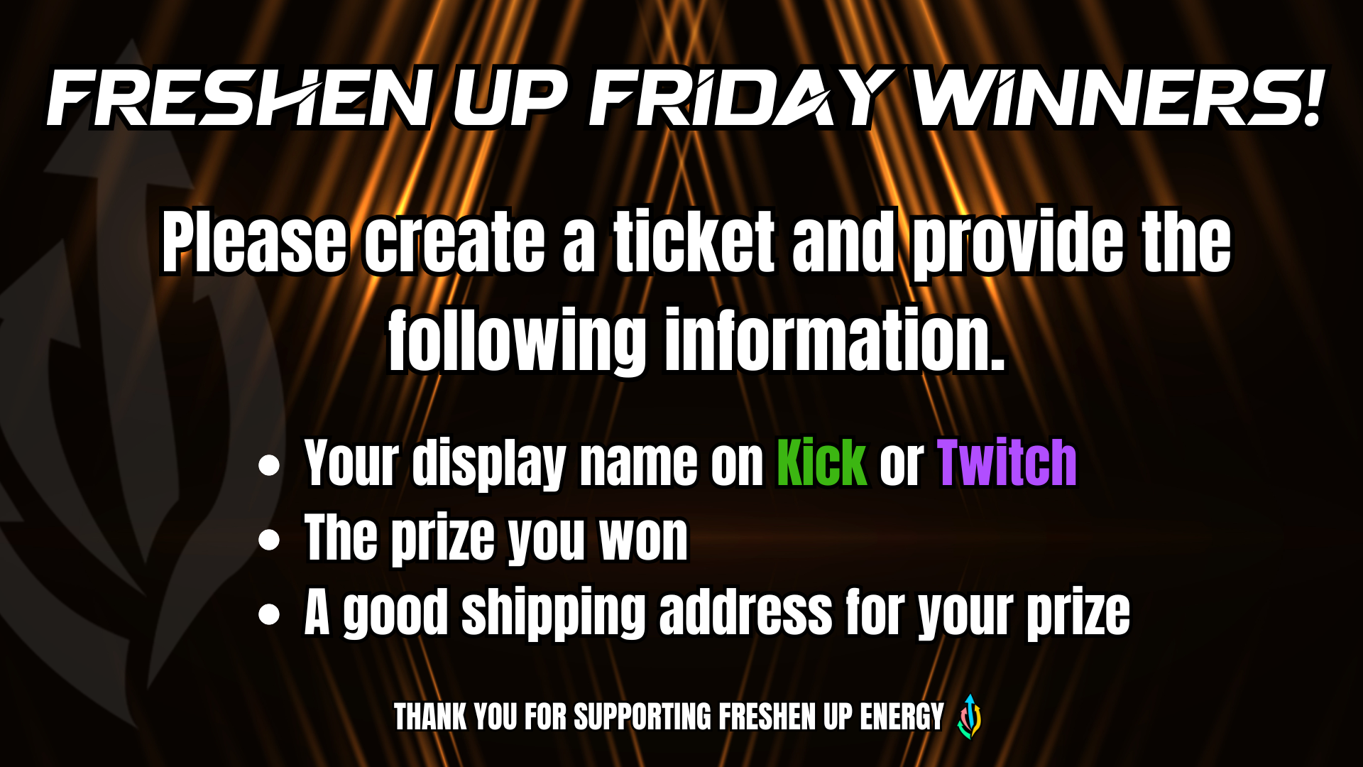To claim a giveaway if you are a WINNER, you need to type in chat within the time BOTRIX needs input in chat to claim, alongside join the Freshen Up Energy discord and/or create a ticket or message Jordan or Ilyza to provide a real address or PO Box.
