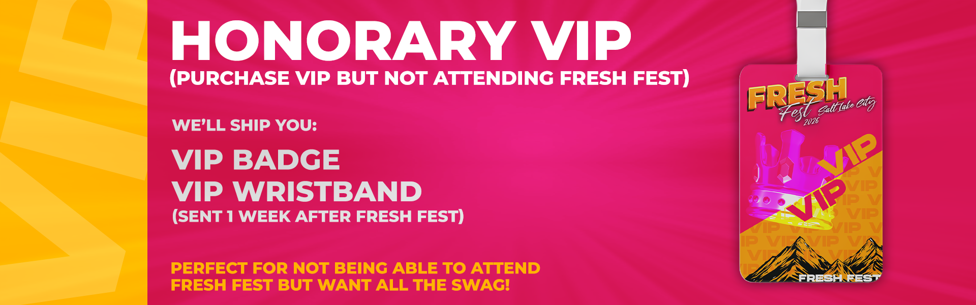 An Honorary VIP Founders Pass is available for supporters who cannot make it to Salt Lake City. Honorary VIPs receive a VIP Badge and VIP Wristband shipped directly to them, allowing you to be part of Fresh Fest history from anywhere.